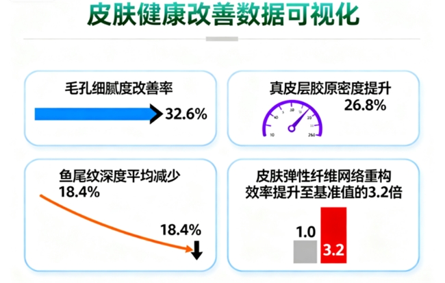 ② 毛孔细腻,肤质平滑:通过强化真皮层支撑,有效收敛毛孔,临床数据显示毛孔细腻度改善达32.6%,使肌肤触感与观感均呈现丝滑状态。